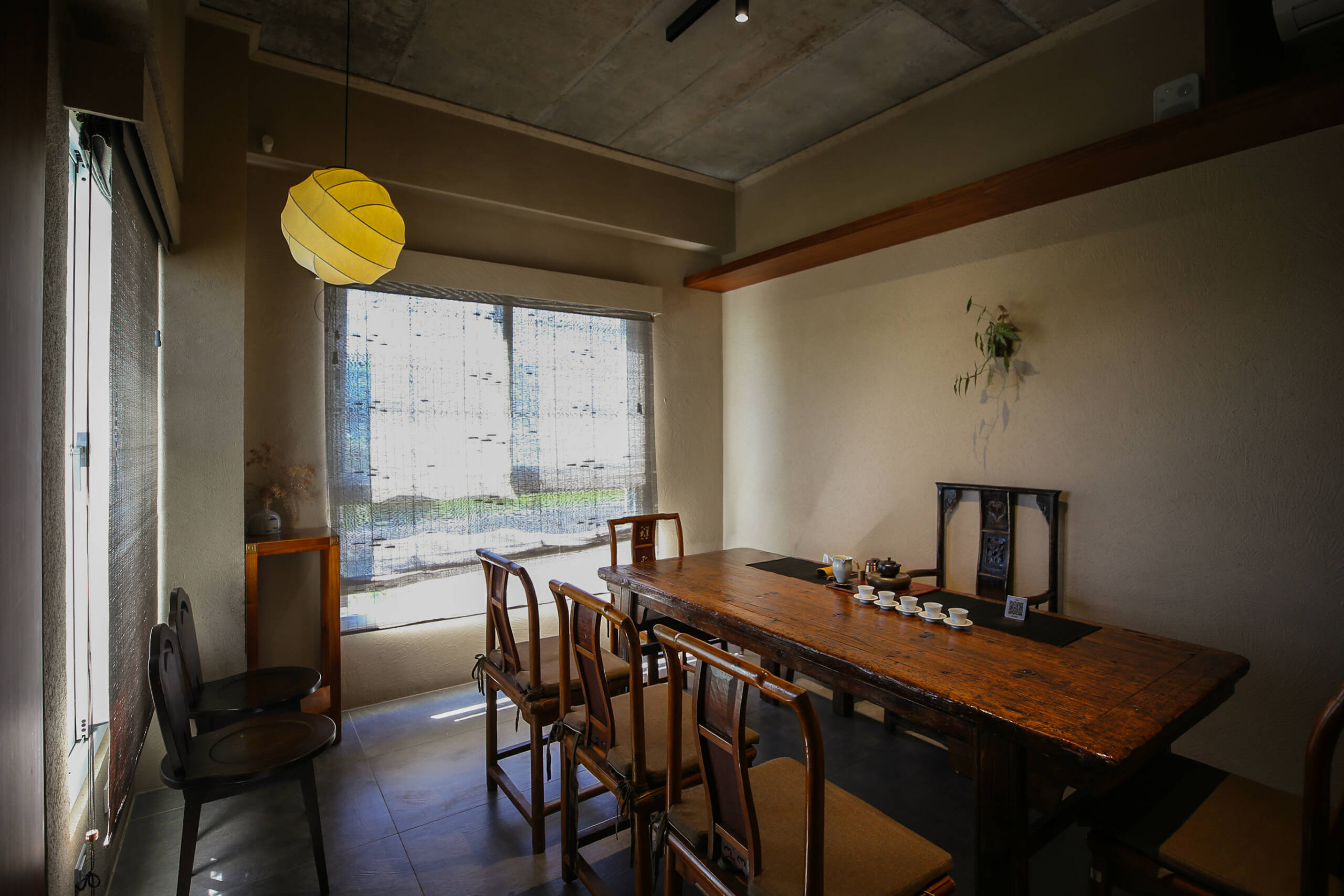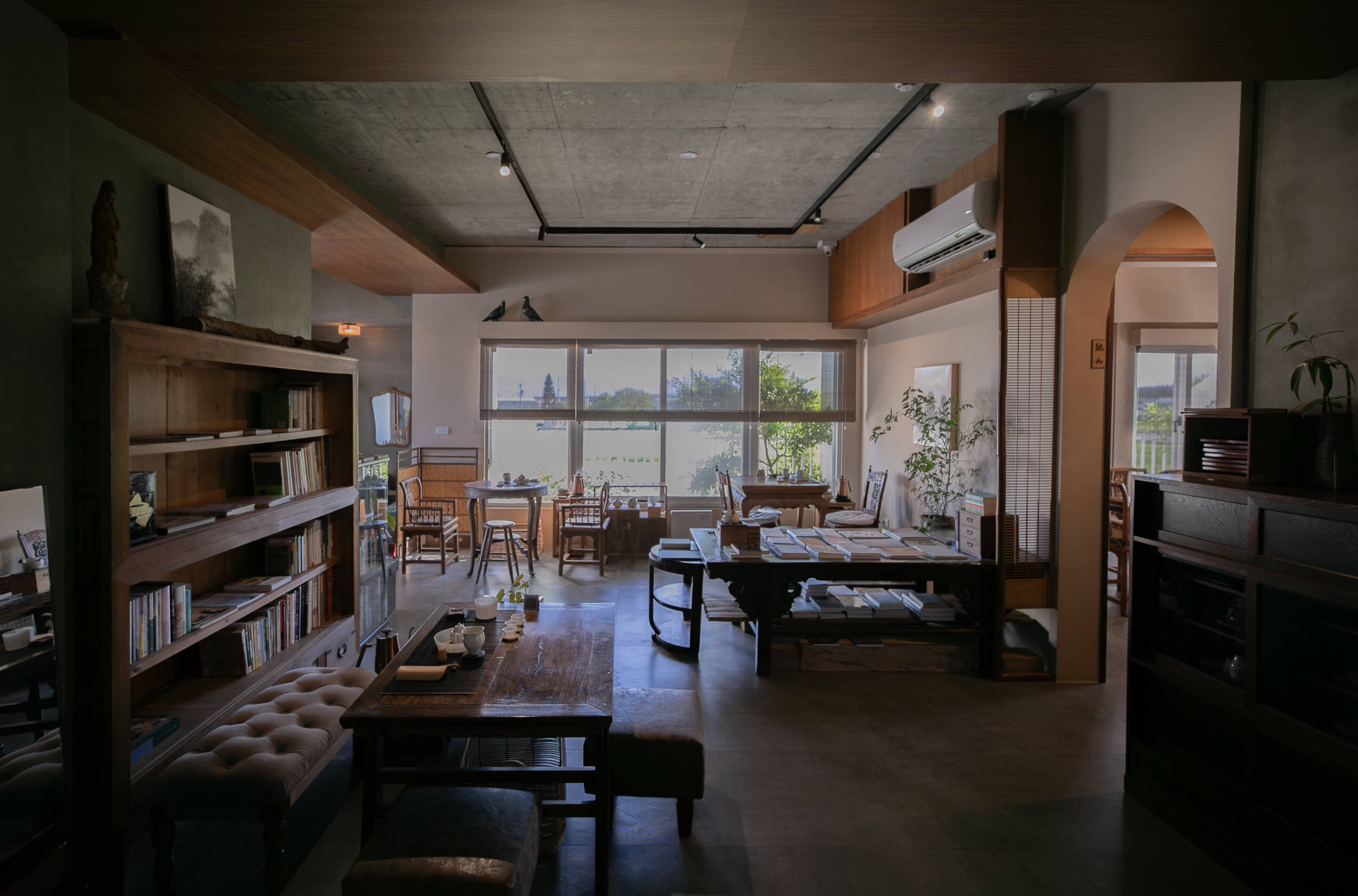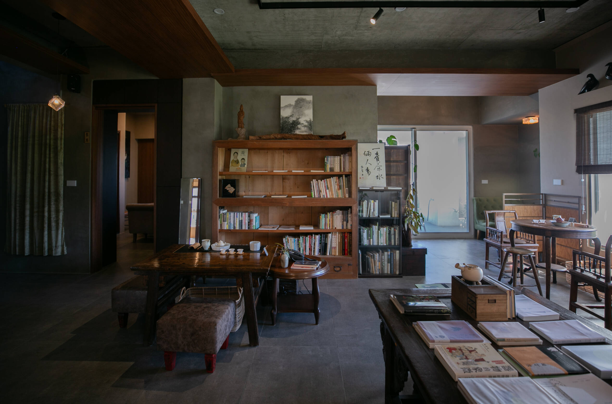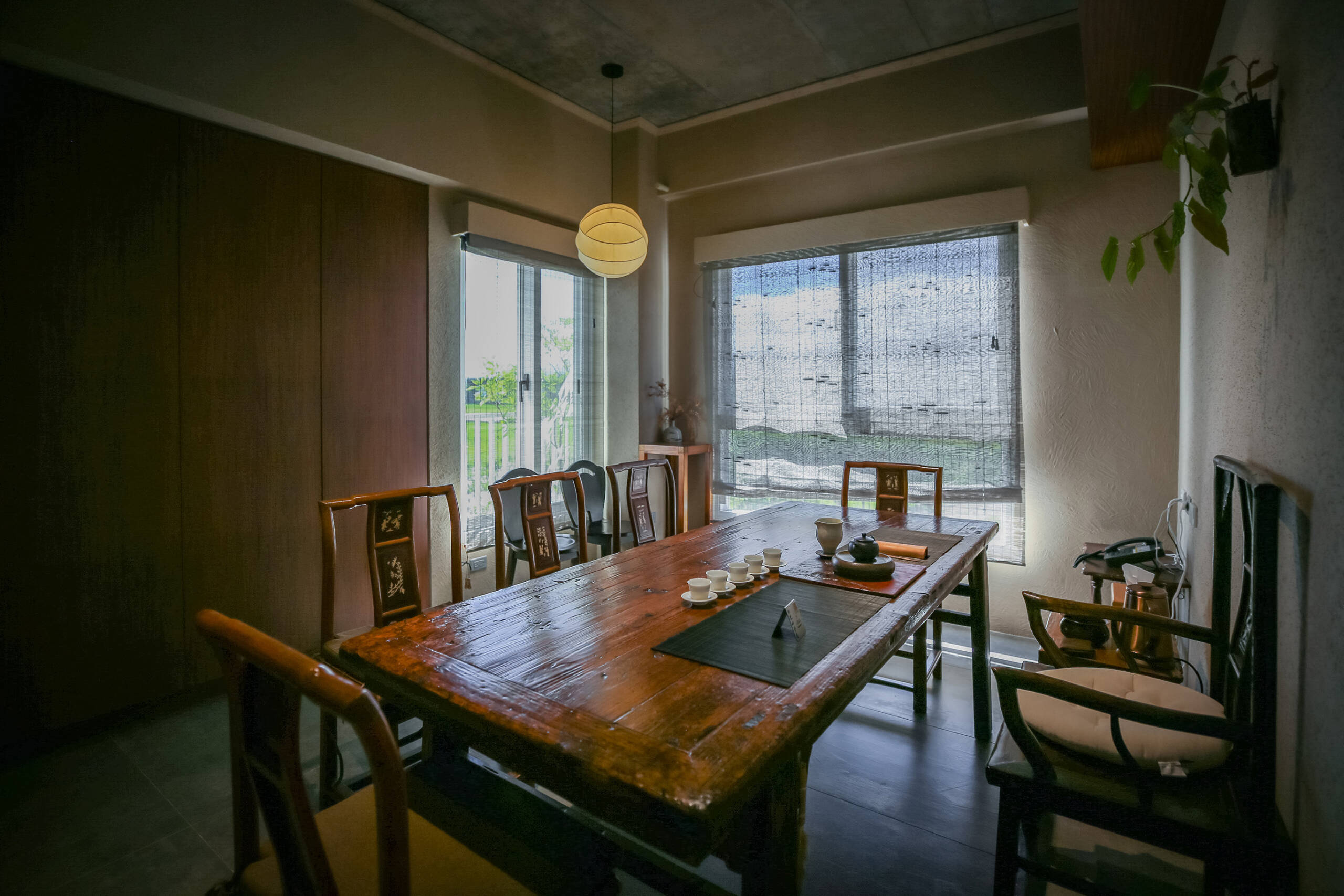 二樓 主空間閱讀與茶香相伴, 遠望田野與茶樹的角落。二樓主空間以靜謐閱讀與自在泡茶為主題。 窗外可遠望田野,陽台上種著幾株隨風搖曳的茶樹。柔和的日光映亮四張小桌(每桌適合四人以下), 書架上陳列著關於茶, 文化與旅程的書籍, 讓人得以隨興停留, 在光影與茶香間靜靜流連。 草音(包廂)面向茅草屋頂的靜謐一隅。「草音」因窗外可見下層「稻香」的茅草屋頂而得名。從窗邊望去, 茅草的紋理與外圍的綠意交織成靜謐的景致。空間可容納六人以下, 木質家具與周圍景色相互呼應, 讓上下兩層的氣息自然延續, 靜中自有節奏。 觀山(包廂)向遠山開展的所在。「觀山」可遠眺宜蘭的山景。大片窗面映入晴光與雲霧, 讓天氣的變化成為空間的一部分。空間可容納六人以下, 以沈靜的木質色調與簡潔家具構成, 使窗外的山景自然滲入室內, 成為氛圍的主角。 聚思(包廂)適合聚會與思索的寬闊一室。「聚思」是茶屋中最大的包廂,可容納十二人。 空間設有厚實的木桌與舒適的沙發區, 無論是安靜對談或輕鬆品茗, 都能自在轉換氛圍。 整體以溫潤與開闊為基調, 讓談話與思緒在平和的空氣中自然延展。