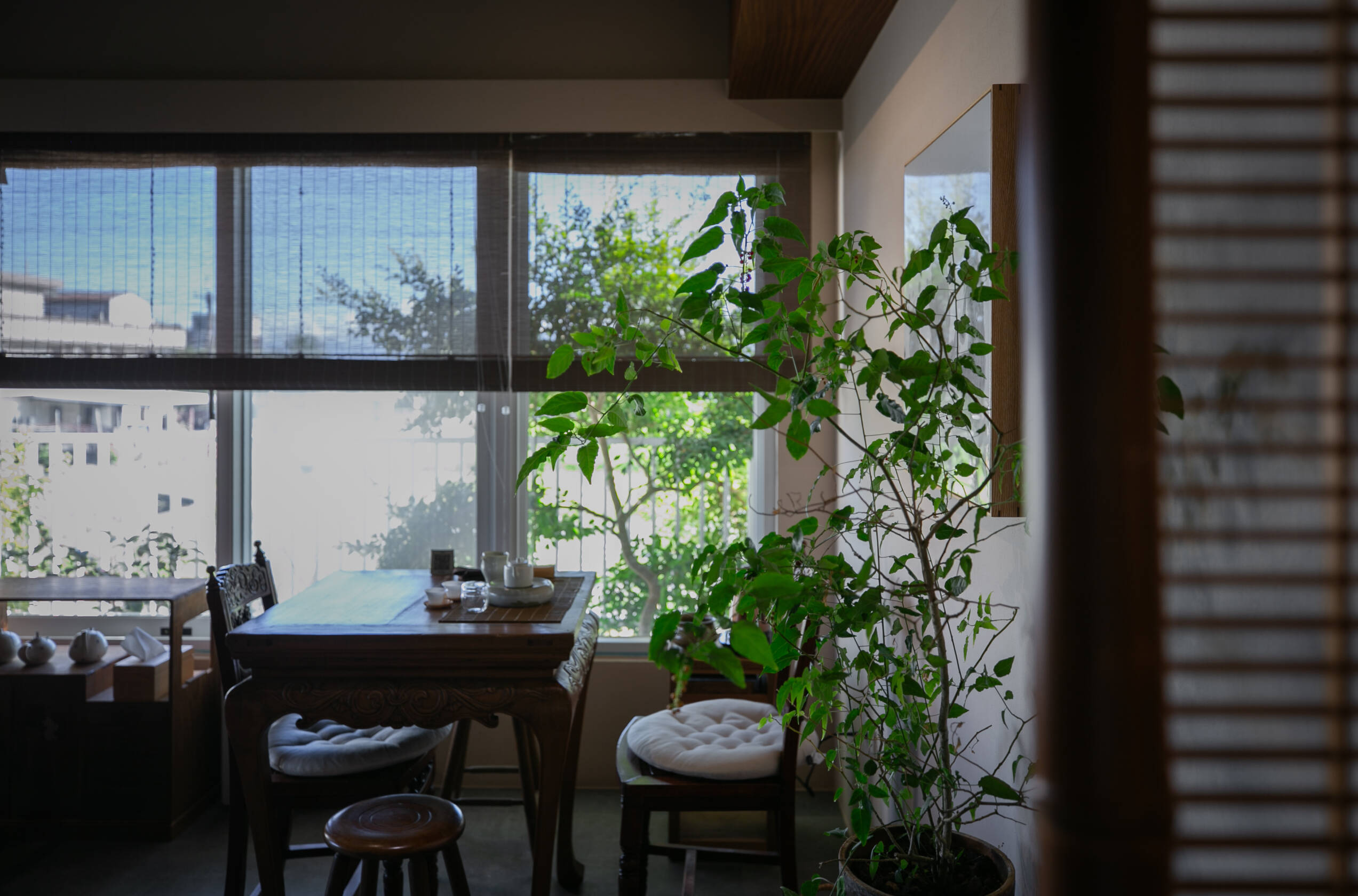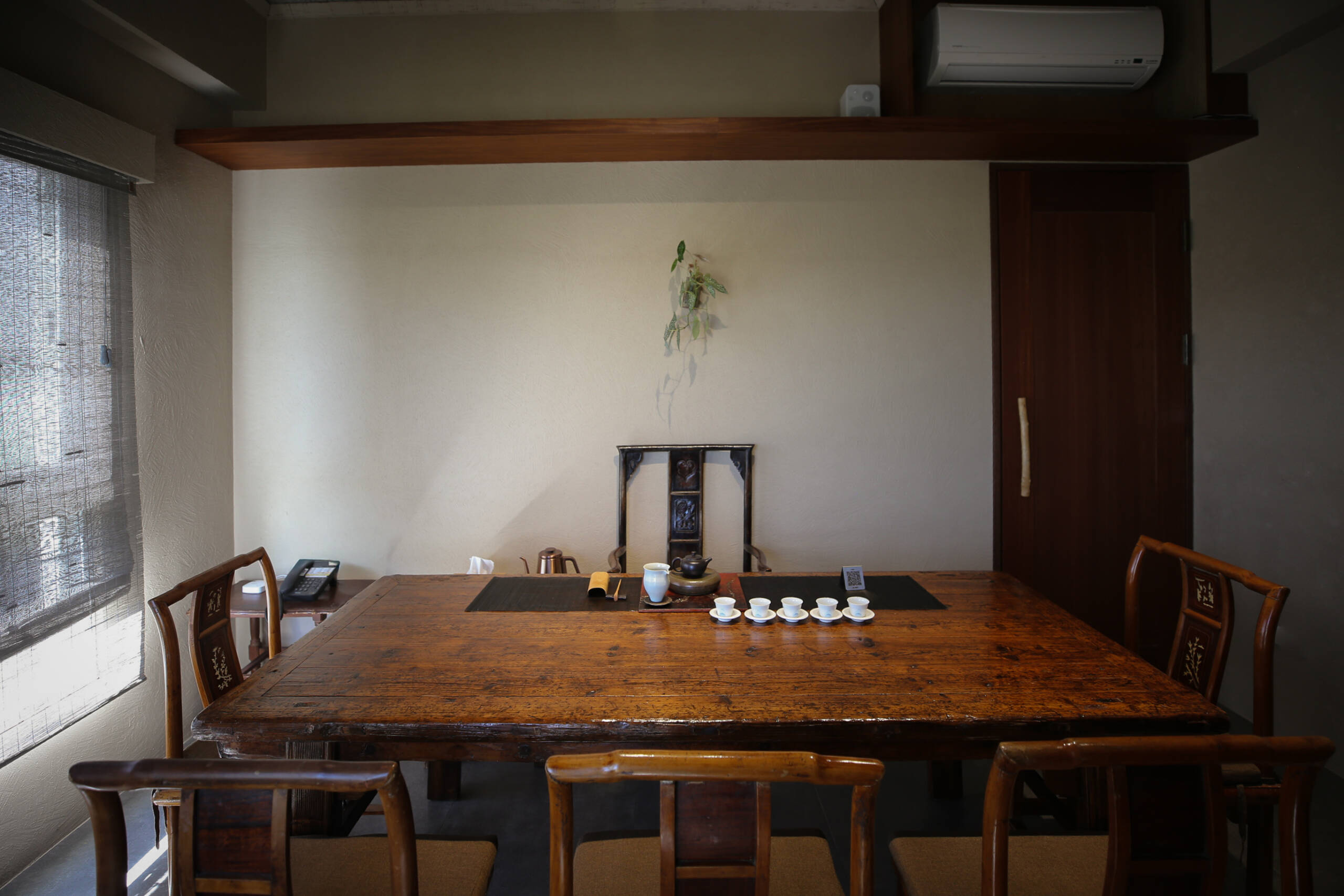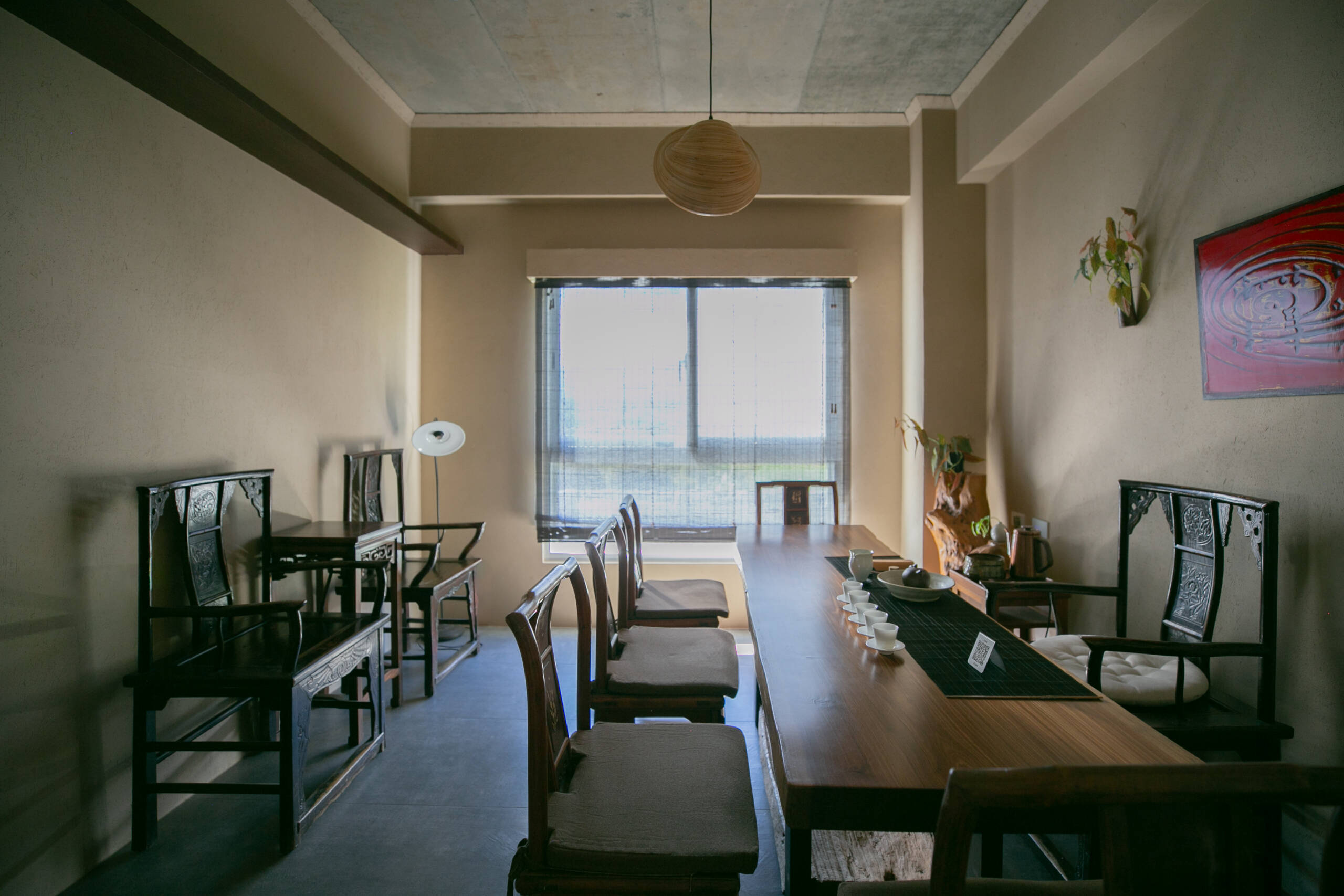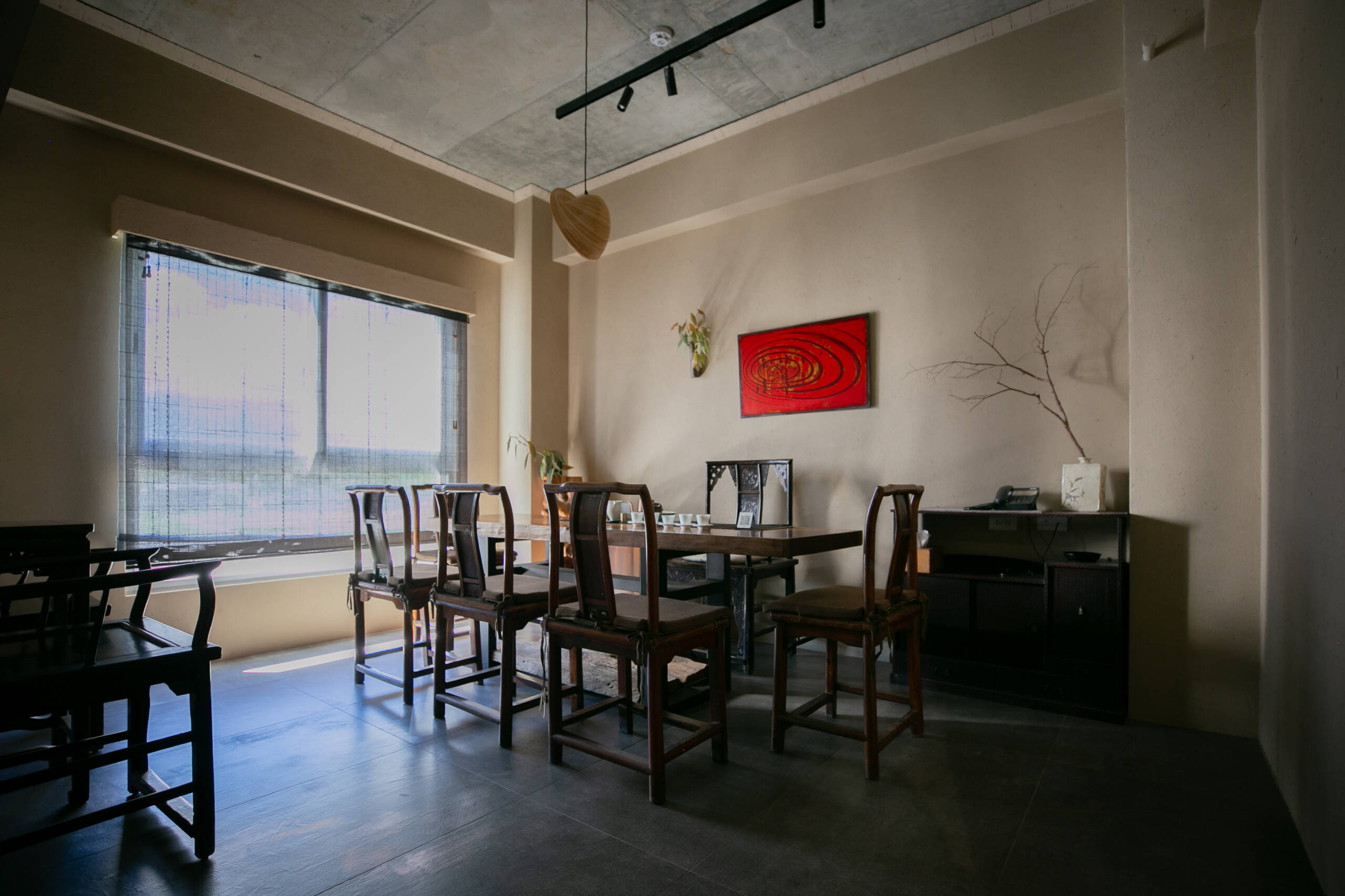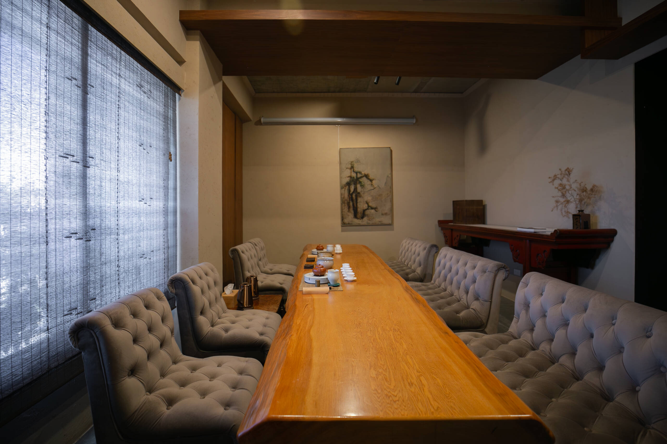 二樓 主空間閱讀與茶香相伴, 遠望田野與茶樹的角落。二樓主空間以靜謐閱讀與自在泡茶為主題。 窗外可遠望田野,陽台上種著幾株隨風搖曳的茶樹。柔和的日光映亮四張小桌(每桌適合四人以下), 書架上陳列著關於茶, 文化與旅程的書籍, 讓人得以隨興停留, 在光影與茶香間靜靜流連。 草音(包廂)面向茅草屋頂的靜謐一隅。「草音」因窗外可見下層「稻香」的茅草屋頂而得名。從窗邊望去, 茅草的紋理與外圍的綠意交織成靜謐的景致。空間可容納六人以下, 木質家具與周圍景色相互呼應, 讓上下兩層的氣息自然延續, 靜中自有節奏。 觀山(包廂)向遠山開展的所在。「觀山」可遠眺宜蘭的山景。大片窗面映入晴光與雲霧, 讓天氣的變化成為空間的一部分。空間可容納六人以下, 以沈靜的木質色調與簡潔家具構成, 使窗外的山景自然滲入室內, 成為氛圍的主角。 聚思(包廂)適合聚會與思索的寬闊一室。「聚思」是茶屋中最大的包廂,可容納十二人。 空間設有厚實的木桌與舒適的沙發區, 無論是安靜對談或輕鬆品茗, 都能自在轉換氛圍。 整體以溫潤與開闊為基調, 讓談話與思緒在平和的空氣中自然延展。