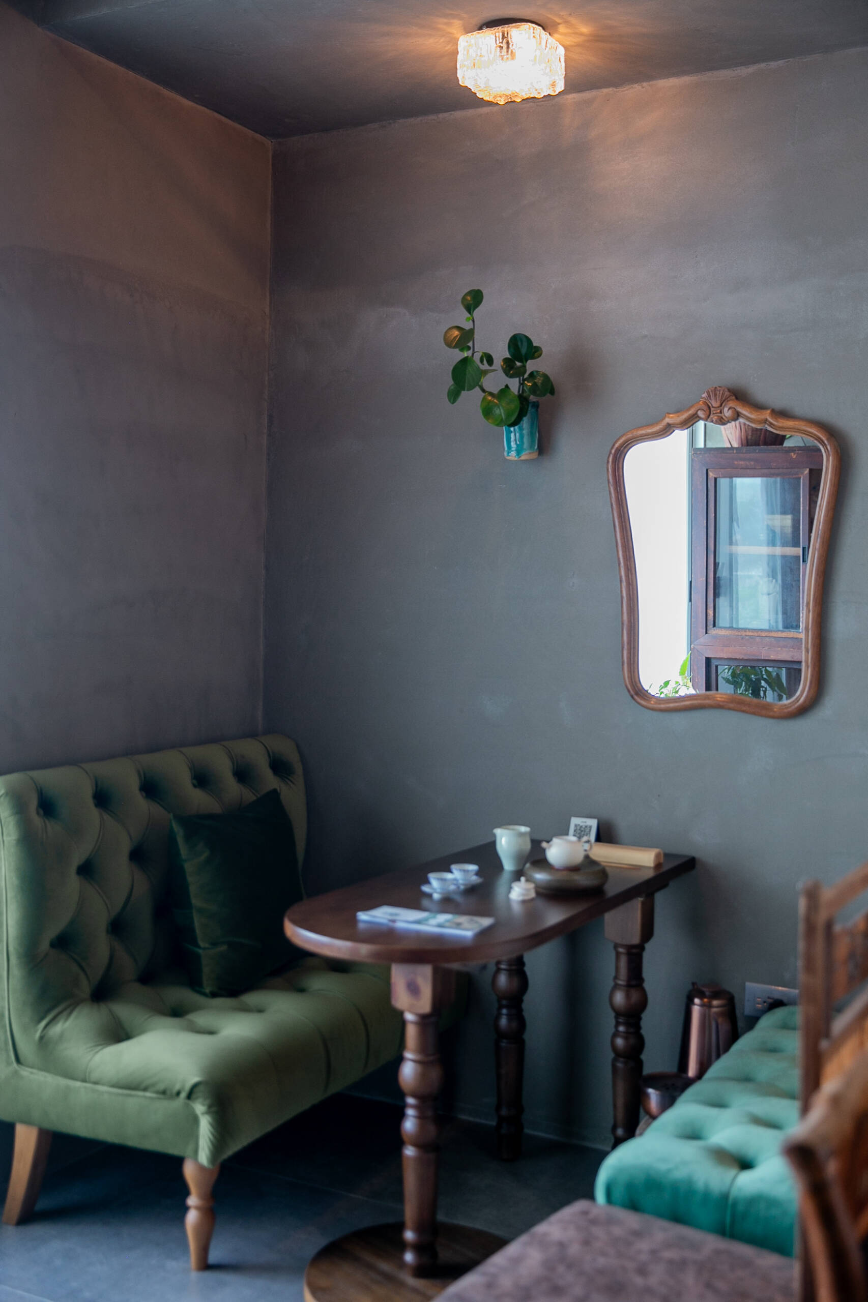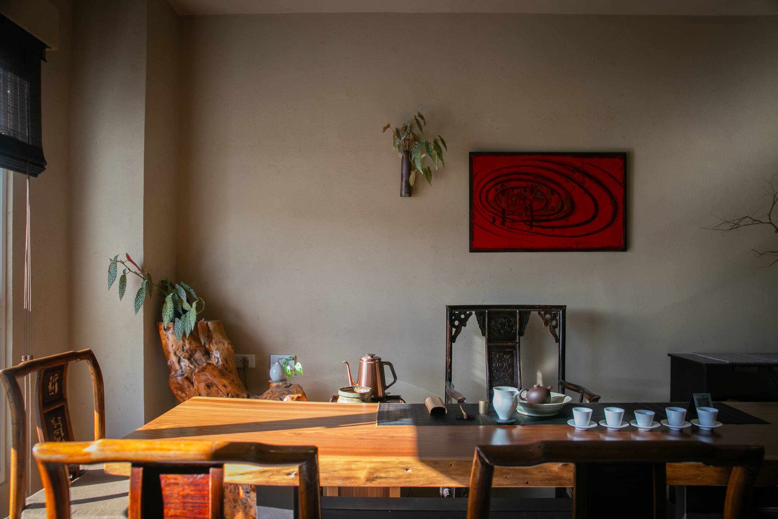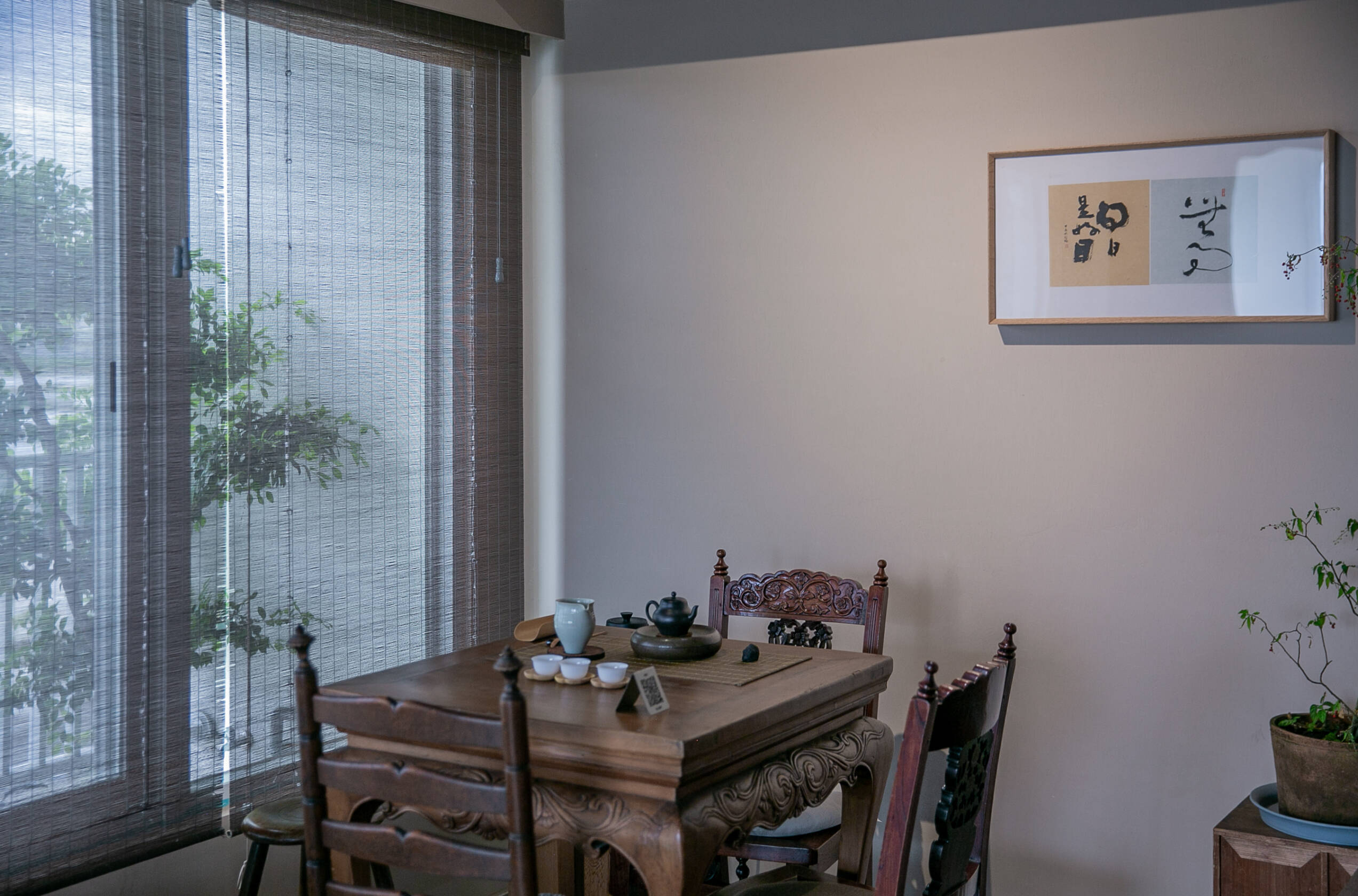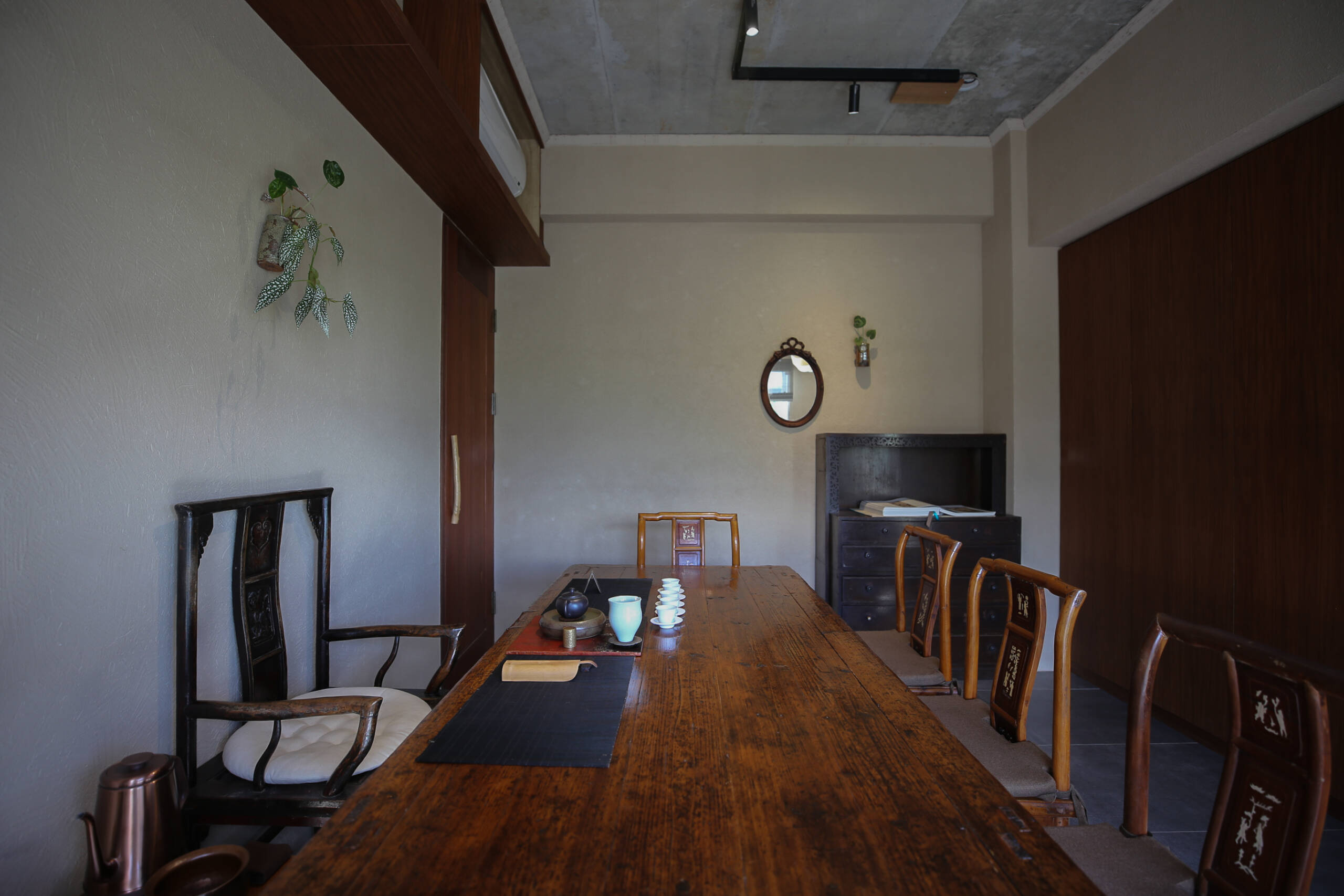 二樓 主空間閱讀與茶香相伴, 遠望田野與茶樹的角落。二樓主空間以靜謐閱讀與自在泡茶為主題。 窗外可遠望田野,陽台上種著幾株隨風搖曳的茶樹。柔和的日光映亮四張小桌(每桌適合四人以下), 書架上陳列著關於茶, 文化與旅程的書籍, 讓人得以隨興停留, 在光影與茶香間靜靜流連。 草音(包廂)面向茅草屋頂的靜謐一隅。「草音」因窗外可見下層「稻香」的茅草屋頂而得名。從窗邊望去, 茅草的紋理與外圍的綠意交織成靜謐的景致。空間可容納六人以下, 木質家具與周圍景色相互呼應, 讓上下兩層的氣息自然延續, 靜中自有節奏。 觀山(包廂)向遠山開展的所在。「觀山」可遠眺宜蘭的山景。大片窗面映入晴光與雲霧, 讓天氣的變化成為空間的一部分。空間可容納六人以下, 以沈靜的木質色調與簡潔家具構成, 使窗外的山景自然滲入室內, 成為氛圍的主角。 聚思(包廂)適合聚會與思索的寬闊一室。「聚思」是茶屋中最大的包廂,可容納十二人。 空間設有厚實的木桌與舒適的沙發區, 無論是安靜對談或輕鬆品茗, 都能自在轉換氛圍。 整體以溫潤與開闊為基調, 讓談話與思緒在平和的空氣中自然延展。